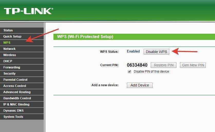 Если ее на корпусе нет, то это не значит, что функция WPS на роутере отсутствует. Просто производитель сэкономил и не стал ее выносить на корпус в виде кнопки. Настройку включения-выключения функции WPS на маршрутизаторе TP-Link необходимо искать в панели управления.