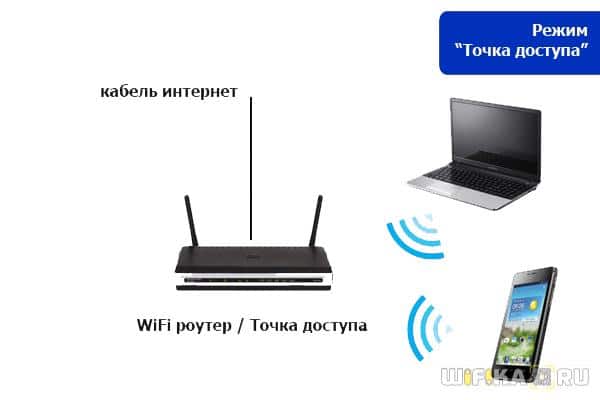 В режиме точки доступа, или как его называют иностранцы «Access Point», роутер работает как устройство, которое превращает кабельный сигнал в беспроводной. Основное отличие маршрутизатора в режиме точки доступа от другого сетевого прибора, который собственно называется «точка доступа», в том, что он не только раздает WiFi, то есть превращает в радиосигнал проводной интернет, но и имеет функционал для раздачи IP адресов и перенаправления портов, в чем и заключается основная функция именно роутера.