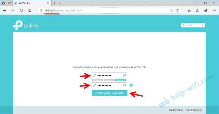 Должна появится страница, на которой нужно установить пароль роутера (пароль администратора). Этот пароль в дальнейшем нужно будет вводить каждый раз, когда вы будете заходит в настройки TP-Link Archer C6. Необходимо придумать пароль, указать его в соответствующем поле (2 раза) и нажать на кнопку «Приступить к работе».