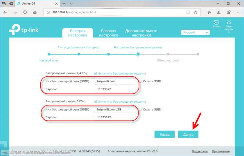 Дальше у нас настройка Wi-Fi сети. Здесь все еще проще. Нужно сменить имя сети (SSID) для двух сетей (одна в диапазоне 2.4 ГГц, вторая в диапазоне 5 ГГц) ну и сменить пароль. Пароль желательно где-то записать и не забыть. Нажимаем «Далее».