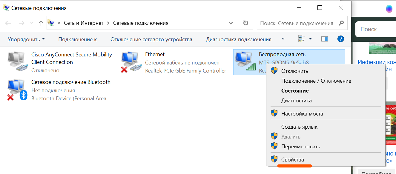 - Щелкните правой кнопкой мыши по разделу Беспроводная сеть и выберите Свойства.