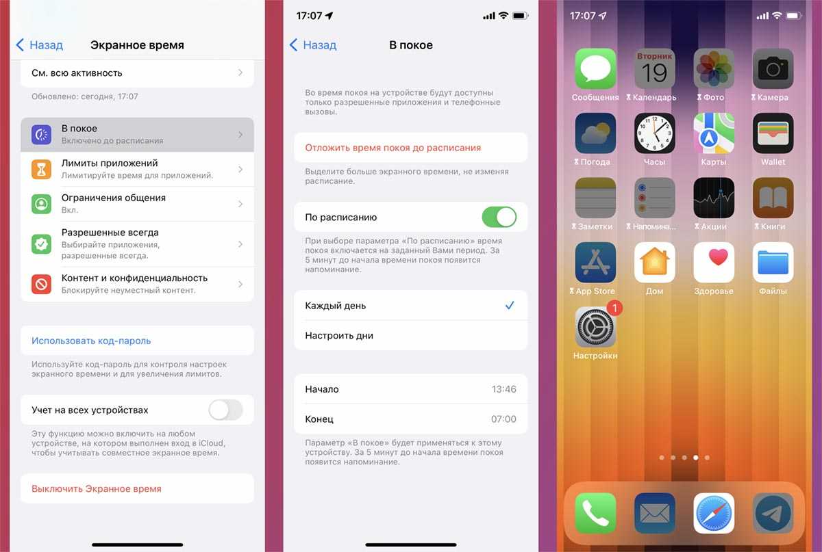 Не все знают, что в iOS есть опция под названием Режим покоя. Он позволяет не полностью отключать звонки, сообщения или уведомления, а частично снизить их активность в выбранные промежутки времени. Так, например, можно установить ограничение на ряд приложений в вечернее время, а отключать уведомления уже на всю ночь.