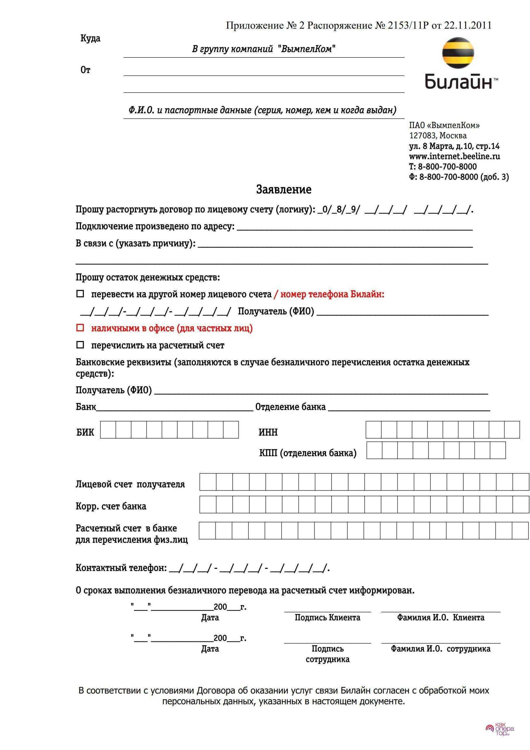 - Заполняется заявление в офисе Билайн или после скачивания через веб-кабинет официального портала.