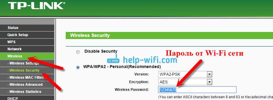 В панели правления перейдите на вкладку Wireless (Беспроводной режим) — Wireless Security (Защита беспроводного режима). В поле Wireless Password (Пароль PSK) вы увидите пароль от вашей Wi-Fi сети.