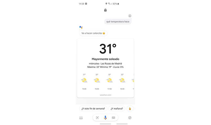 Виртуальный помощник есть эта услуга. В любое время мы можем сказать нашему мобильному «Окей, Google, какая температура?» И он ответит нам, как градуснику, градусами. Но он также сообщает нам, какова погодная ситуация, прогноз на день и детали развития на каждый час. И, конечно же, мы можем спросить у вас прогноз на ближайшие дни.