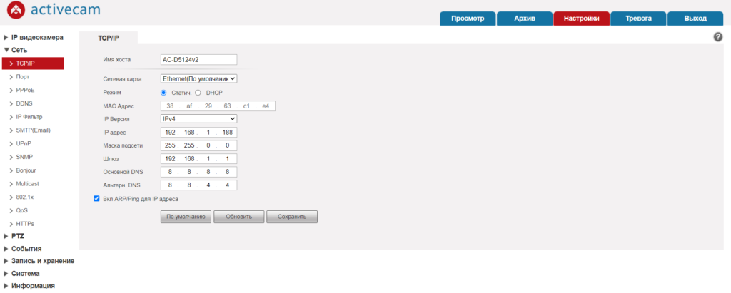 Как поменять IP адрес на камере? Заходим в меню СЕТЬ- TCP/IP и устанавливаем адрес. Если нужно чтобы камера получила адрес сети автоматически, то просто устанавливаем DHCP