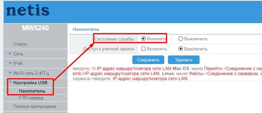 - Настройка USB – Накопитель – Состояние службы – Включить