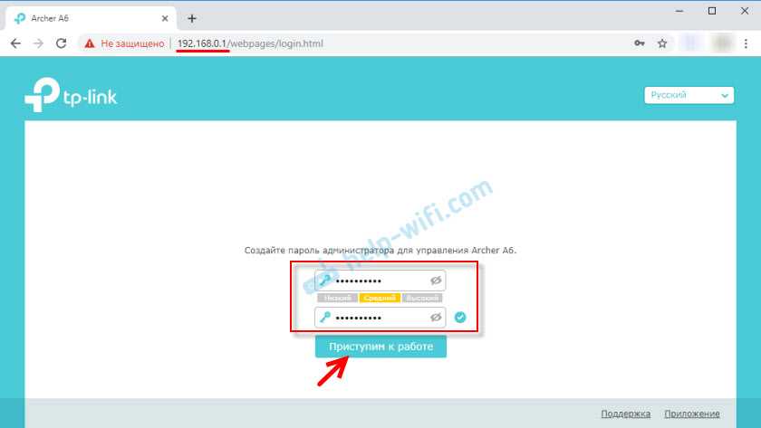 Должна появится страница, на которой нужно установить пароль роутера (пароль администратора). Этот пароль в дальнейшем нужно будет вводить каждый раз, когда вы будете заходит в настройки TP-Link Archer C6. Необходимо придумать пароль, указать его в соответствующем поле (2 раза) и нажать на кнопку «Приступить к работе».