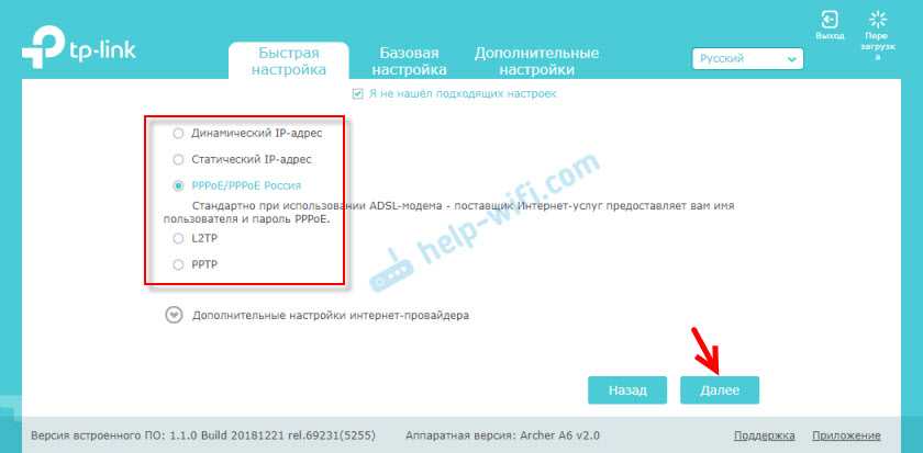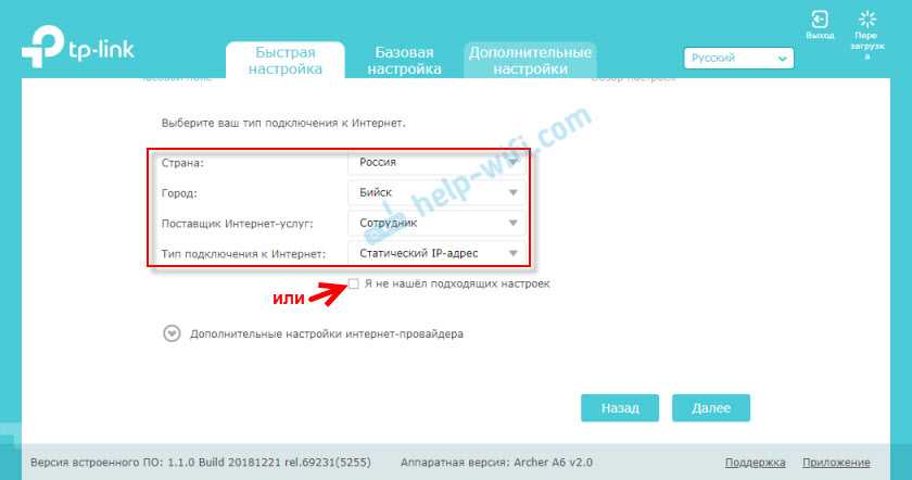 Дальше нужно настроить подключение к интернету. На Archer C6 есть возможность выбрать свою страну, город, провайдера, и тип подключения к интернету. Попробуйте.