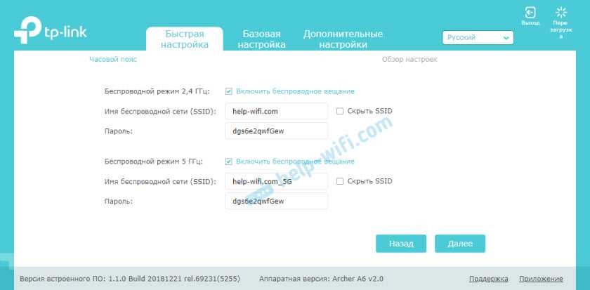 Дальше у нас настройка Wi-Fi сети. Здесь все еще проще. Нужно сменить имя сети (SSID) для двух сетей (одна в диапазоне 2.4 ГГц, вторая в диапазоне 5 ГГц) ну и сменить пароль. Пароль желательно где-то записать и не забыть. Нажимаем «Далее».