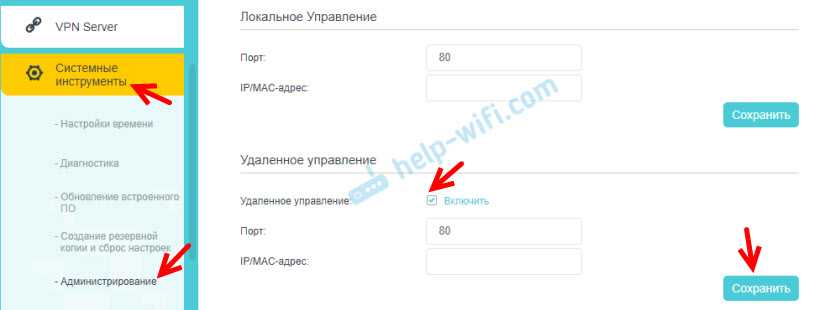 На роутерах с новой панелью управления (которая голубая), нужно зайти в раздел «Системные инструменты» – «Администрирование». Там кроме IP-адреса (с которого можно зайти на роутер через интернет) можно так же прописать MAC-адрес конкретного устройства. Так же обязательно нужно поставить галочку возле «Включить» и сохранить настройки.