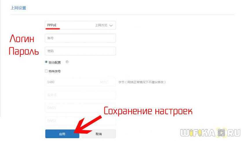 Если у вас подключение по типу PPPoE, то вводим в указанные на изображении ниже поля логин и пароль