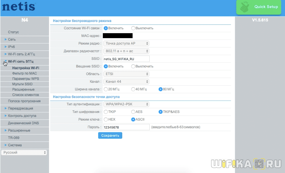 В нижней части страницы находится Настройка беспроводной сети на роутере Netis N4. Настраивать нужно каждый диапазон в отдельности, выбирая его в соответствующей строке. Сначала смотрим диапазон 2.4 ГГц. Здесь меняем имя сети WiFi в поле «SSID» и в поле «Пароль» придумываем и прописываем ключ безопасности сети.