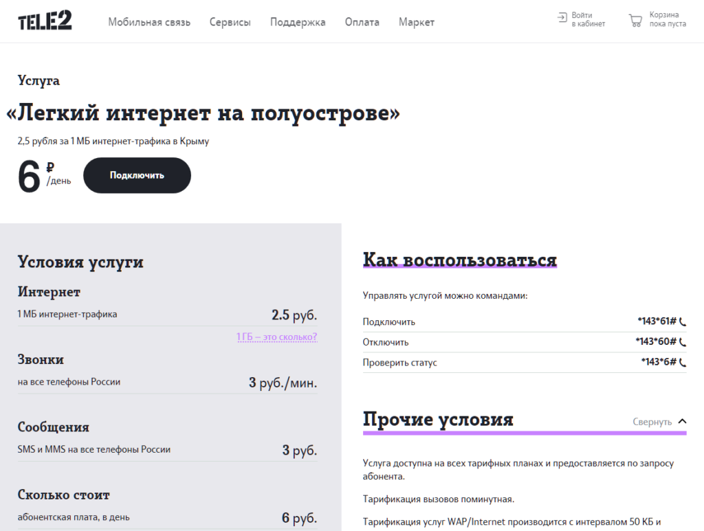 Более простой метод заключается в наборе комбинации USSD. Запрос осуществляется совершенно бесплатно. Рассмотрим в таблице, как активировать, отключить «Интернет на полуострове» Теле2: