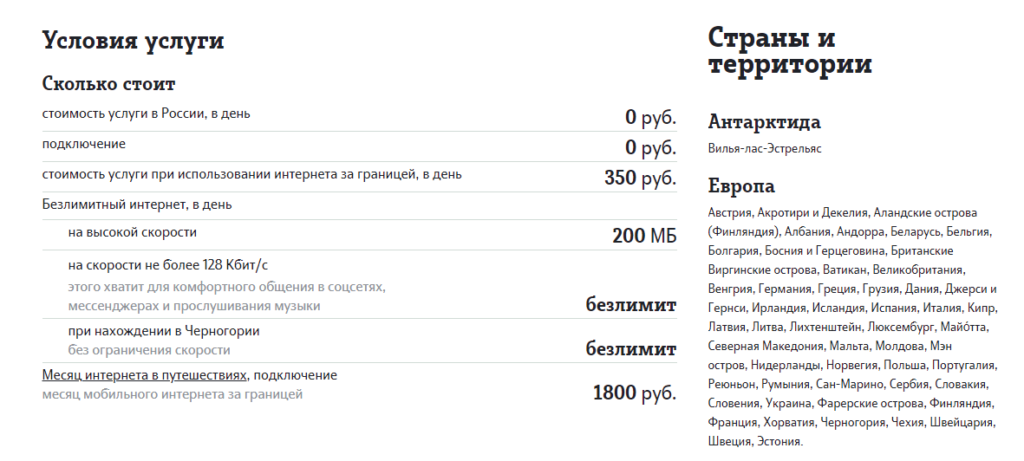 - Плата за использование услуги во время пребывания абонента на территории Российской Федерации: отсутствует;