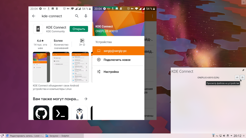 Для обмена файлами между компьютером Linux и Android можно использовать программу KDE-Connect. У неё есть приложение для Android, она встроена в окружение KDE, а для Gnome есть расширение GSConnect. Утилита позволяет передавать файлы на компьютер прямо с телефона, а также монтировать общую папку, в которую можно скидывать как файлы на компьютере, так и файлы на телефоне. Очень удобно. Читайте подробнее в статье про настройку KDE-Connect.
