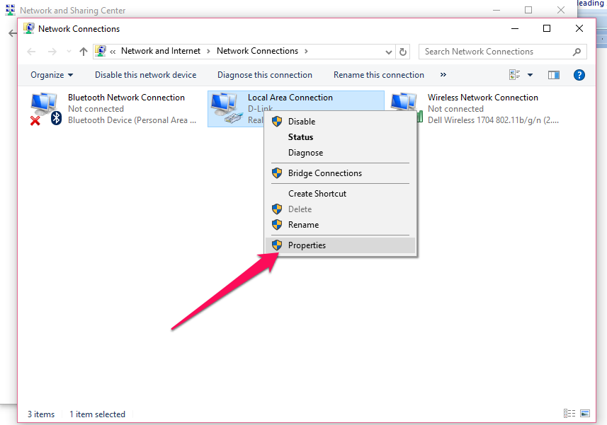 Шаг 9: Окно сетевых подключений будет тем, что вы видите на этом этапе. Вы можете четко увидеть значок подключения по локальной сети. Щелкните его правой кнопкой мыши и выберите «Свойства». (То же действие можно выполнить, дважды щелкнув Подключение по локальной сети и выбрав свойства).