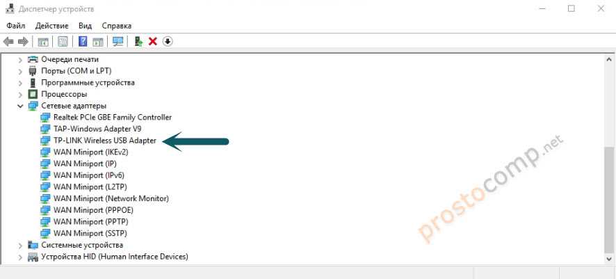 Адаптер должен появится в диспетчере устройств. В его названии скорее всего будут слова WLAN, Wireless, 802.11. Или будет название компании производителя. Как в моем случае, адаптер от TP-Link.