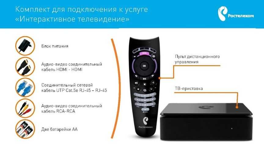 - Итак, вы пришли в офис продаж Ростелеком, заключили договор, оплатили и получили оборудование. Загляните внутрь и проверьте комплектацию. Там должна быть сама приставка, блок питания, пульт с батарейкой, переходники и несколько кабелей: «тюльпан», AV провод, Ethernet шнур, HDMI. Последний присутствует не всегда, но мы рекомендуем купить его отдельно – HDMI передает самую качественную картинку. Также в комплект должна входить инструкция по эксплуатации устройства и пульта, справочник с кодами и заполненный гарантийный талон. По умолчанию, у вас дома уже есть роутер от Ростелеком.