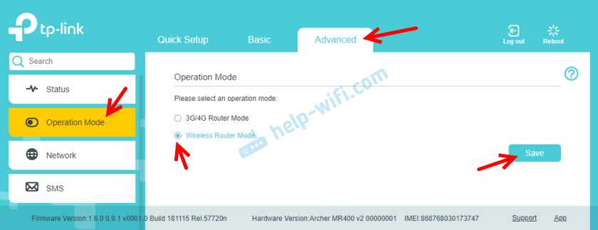 Если вы хотите подключить к TP-Link Archer MR400 интернет по сетевому кабелю, то нужно для начала подключиться к роутеру с компьютера или мобильного устройства по кабелю или Wi-Fi, зайти в настройки и переключить его в соответствующий режим работы.