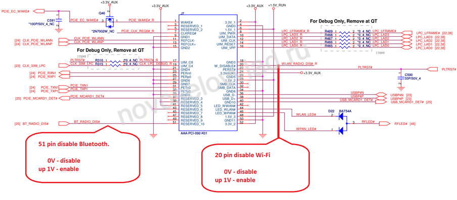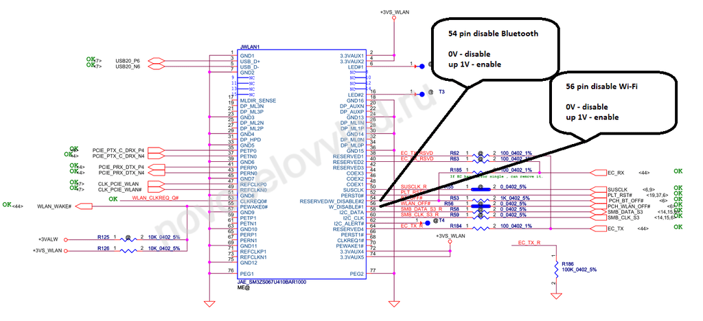 Как мы видим, в разъеме используется 52 контакта. Но наибольший интерес вызывают 20 и 51 контакты, это инвертированные (обозначены #) сигналы для управления состоянием устройства. Положительный потенциал на них, активирует работу устройства. 20 контакт отвечает за работу Wi-Fi, 51 — за работу Bluetooth, если таковой имеется.