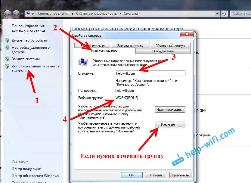 Дальше, слева нажмите на пункт Дополнительные параметры системы. В новом окне перейдите на вкладку Имя компьютера. Вы увидите там название группы. Если там WORKGROUP, то все хорошо. Так и оставляем. Если нет, то измените, нажав на кнопку Изменить. Так же задайте описание для вашего компьютера, главное, что бы оно не повторялось на других компьютерах.