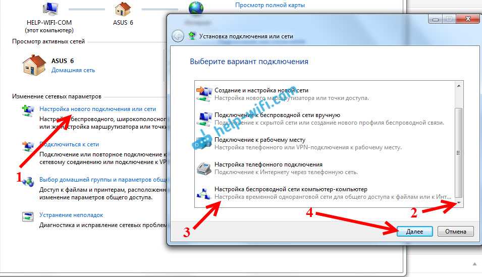 Нажмите на пункт Настройка нового подключения, или сети, если нужно, то прокрутите список и выделите пункт Настройка беспроводной сети компьютер-компьютер. Нажмите Далее. Если у вас нет пункта «компьютер-компьютер», то смотрите информацию по этому вопросу в конце статьи.