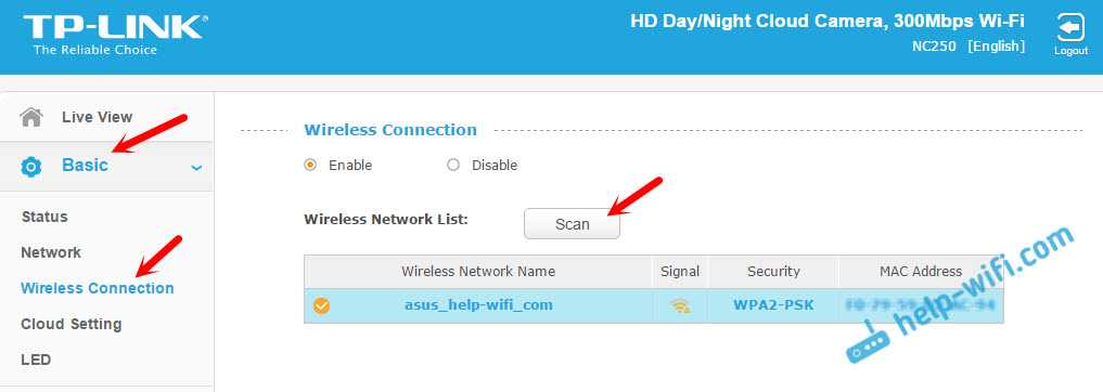 На вкладке «Basic» – «Wireless Connection», можно подключить камеру к нашей Wi-Fi сети. Если это не получилось сделать нажатием кнопок WPS, как я показывал в начале статьи. Достаточно выбрать нужную сеть, указать пароль от сети, и подключится.