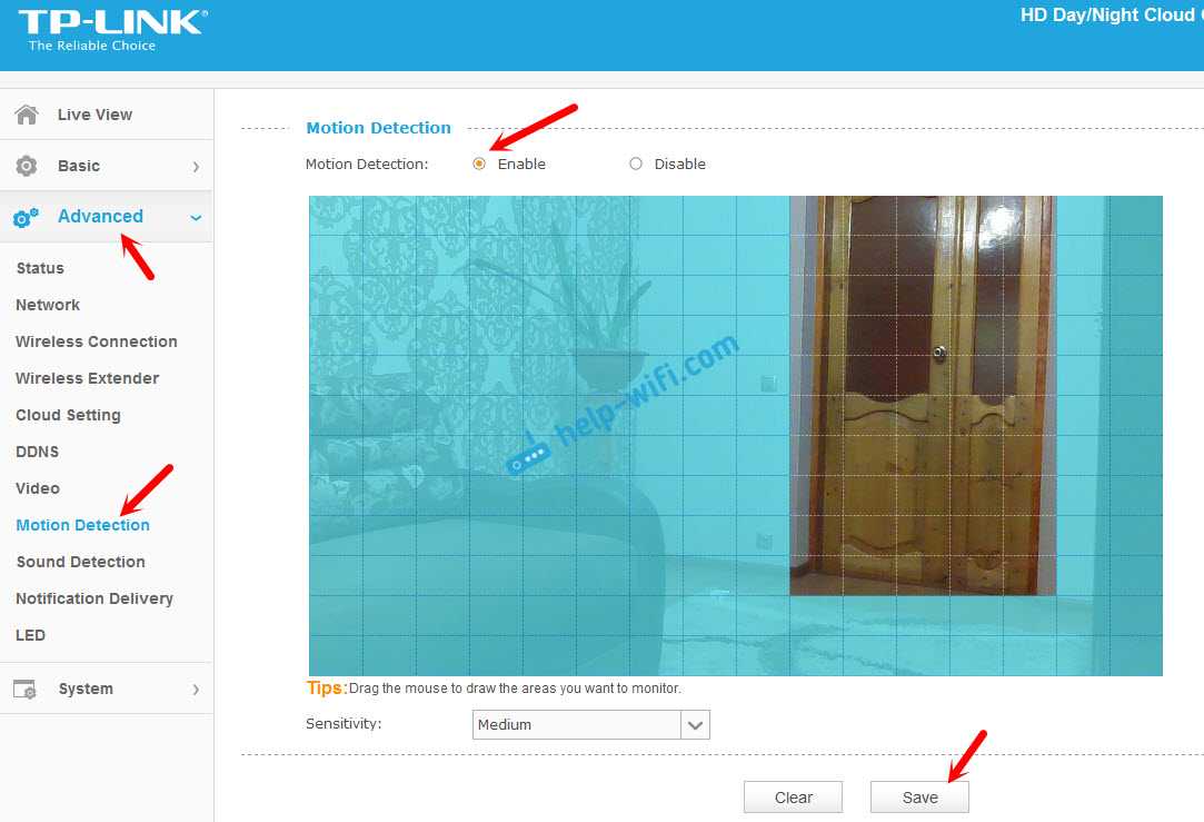 Сначала, на вкладке «Advanced» – «Motion Detection» нужно включить функцию, и настроить область, за которой камера будет наблюдать. Если в этой области появится какое-то движение, то вам будет отправлено уведомление. Так же, можно задать чувствительность камеры.