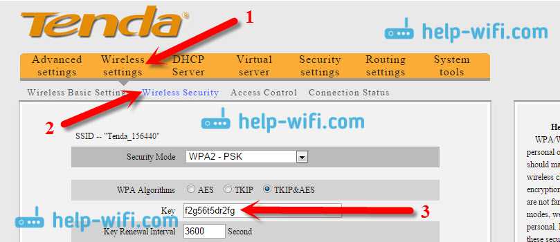 Значит на маршрутизаторах Tenda точно так же заходим в панель управления, переходим на вкладку Wireless settings — Wireless Security и в поле «Key» смотрим пароль.