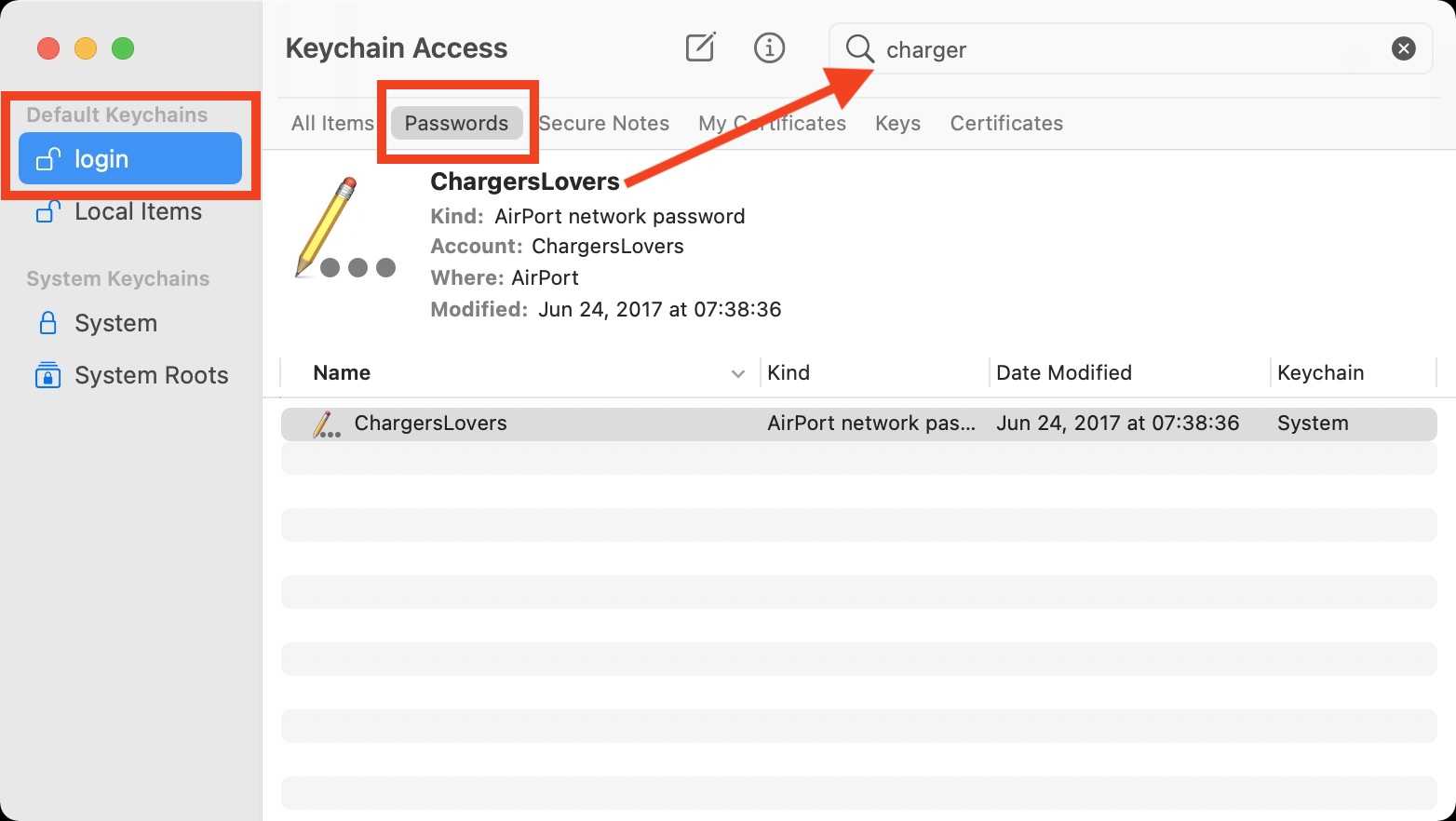 2) In the sidebar, make sure you click on Login, and click on the Password tab. Then search for the network you want the password for by typing parts of this network’s name. Double click on that network.