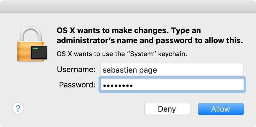 4) You may be prompted to enter your administrator credentials again. Type in your full name as displayed on your Mac’s login screen and your password again.