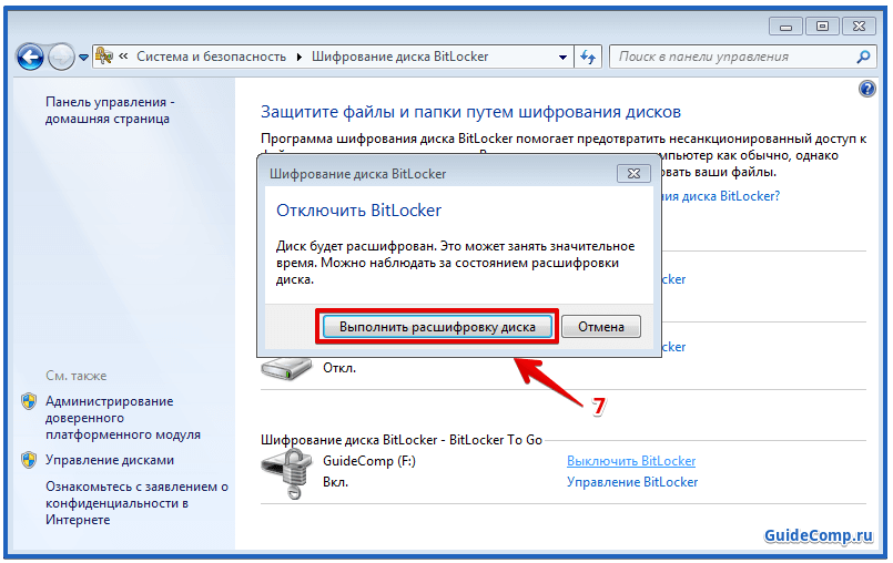 Для отключения функции шифрования BitLocker, необходимо выполнить следующие действия: