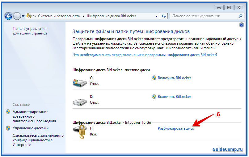 Теперь в списке найдите флешку, для которой обеспечена защита, кликните на пункт «Разблокировать диск» и введите пароль.
