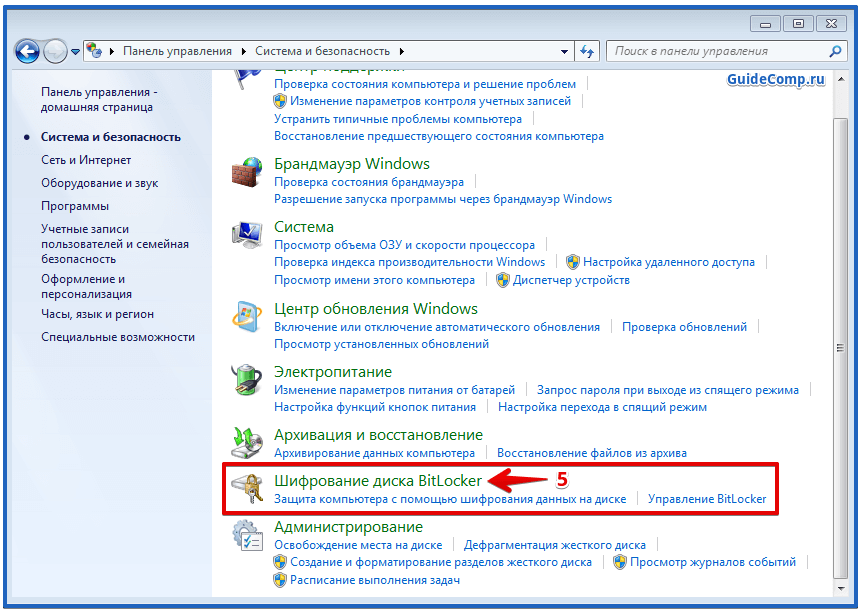 Далее перейдите в раздел «Шифрование диска BitLocker».