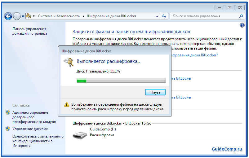 Остается дождаться завершения операции по дешифрации диска. Придется подождать! Так, для диска объемом 8Гб расшифровка диска длилась 32 минуты.
