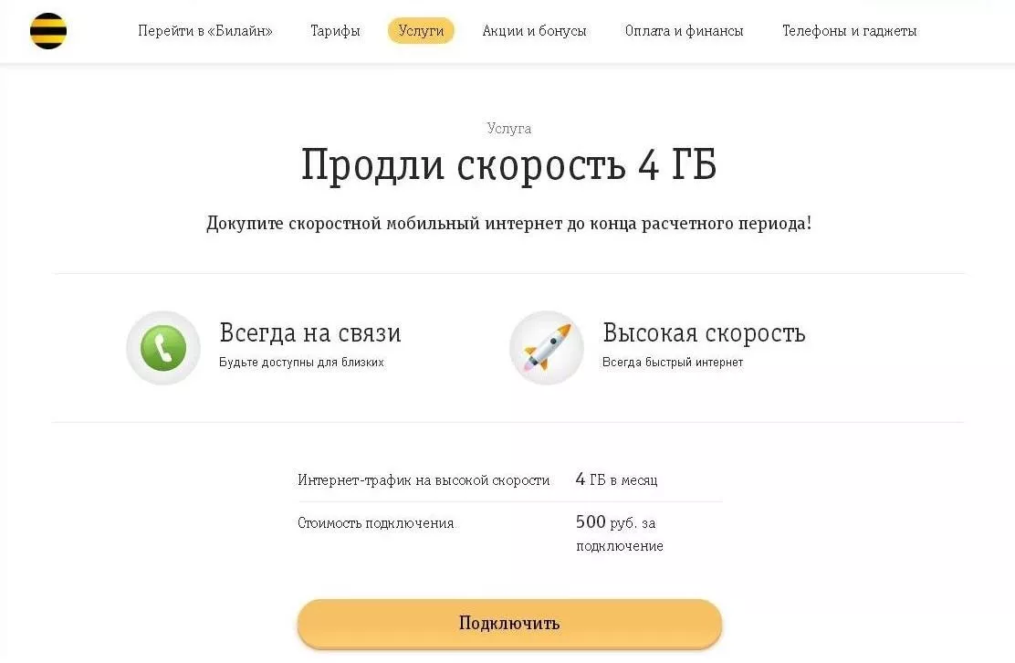 Что делать, когда заканчивается трафик. Если не прибегать к дополнительно активируемым опциям, услуга продли скорость является стандартным решением проблемы. Билайн продлевает скорость на 1 ГБ и на 4 гигабайта в предоплатной, и на 1, 3 и 6 в постоплатной системе расчетов. Это удобно, если не хватило определенного количества веб-трафика. Вы легко сможете добавить нужную численность гигабайт.