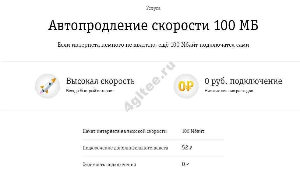 “Автопродление скорости 100 Мб” — цена 100 Мб трафика составляет 52 руб.