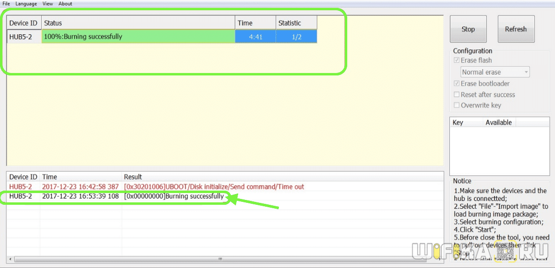 Теперь выделяем строку с названием приставки в USB Burning и жмем на «Start». По завершении появится надпись об успешной прошивке.