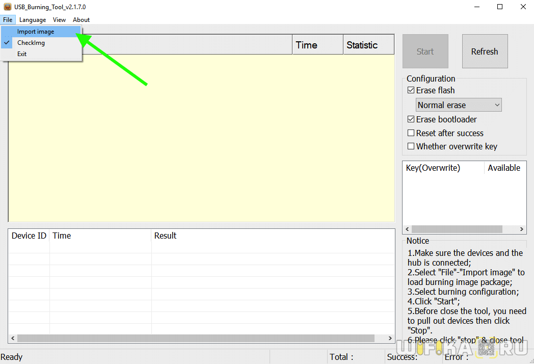 Запускаем программу Amlogic USB Burning Tool и открываем в меню «File» — «Import Image»