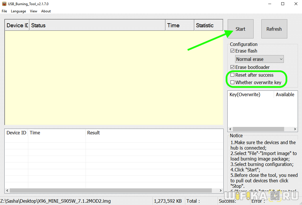 После завершения обратите внимание, что напротив пунктов «Reset after success» и «Whether overwrite keys» сняты флажки. Иначе вся информация на приставке, в том числе ее MAC адрес, поменяются