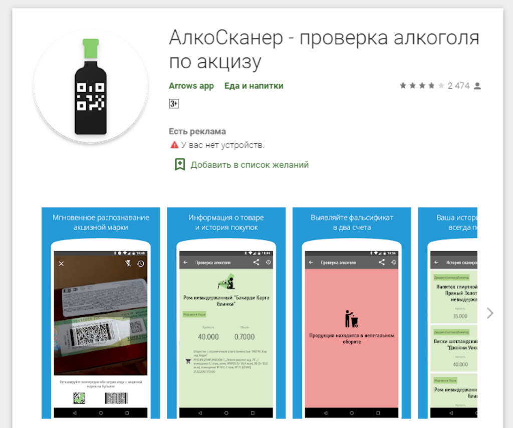 | «Антиконтрафакт Алко» | ФСРАР | более 500 тыс | Android (4.0.3 и выше), iOS (не ниже 8.1) | Необходимость регистрации при доступе к полному функционалу |