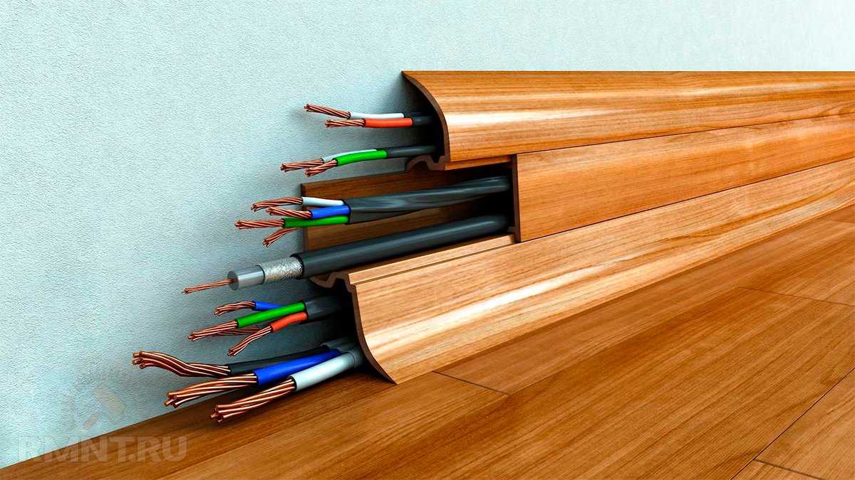 - В современных плинтусах есть каналы для нескольких кабелей. Открывайте их по одному и проводите провода внутри плинтусов до места назначения. С дверными проемами будут проблемы, придется вести напрямую или вокруг двери.