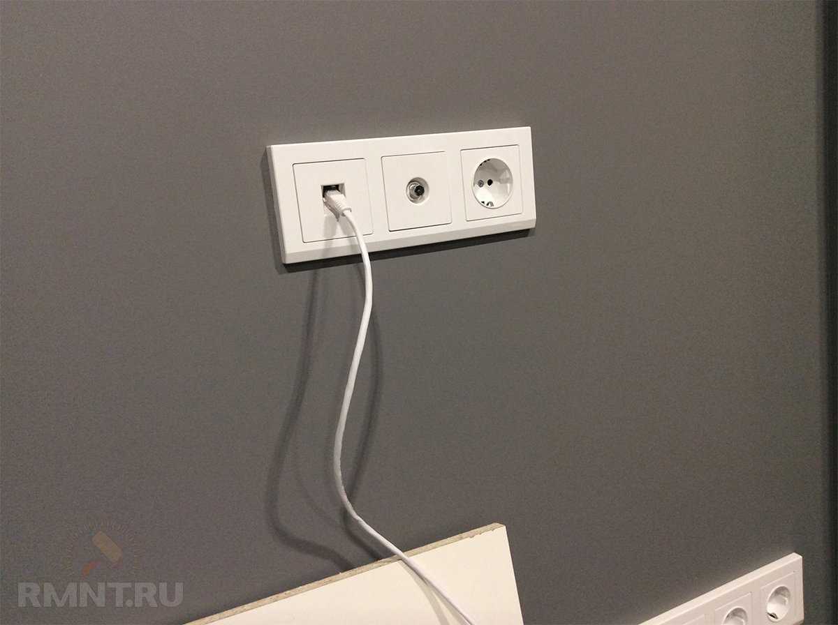 Когда интернет-кабель уже проложен, его нужно присоединить к сетевой розетке или разъёмам. Обязательно оставьте небольшой запас длины кабеля, чтобы спокойно присоединить его. Установочные коробки будут такими же, как и для обычных розеток и выключателей, о которых портал Rmnt.ru подробно писал. Здесь уже допускается расположение интернет-розетки рядом с силовой, их даже объединяют в одну группу установочных коробок с общей рамкой.