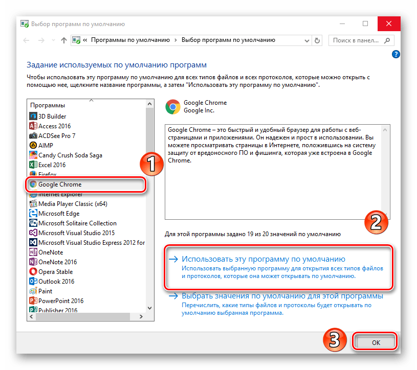 - Откроется окно «Выбор программ по умолчанию», здесь выбираем «Использовать по умолчанию» – «ОК».