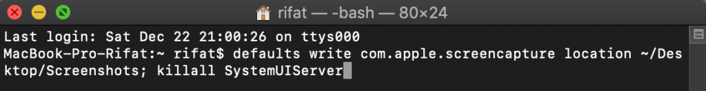 defaults write com.apple.screencapture location ~/Desktop/Screenshots; killall SystemUIServer