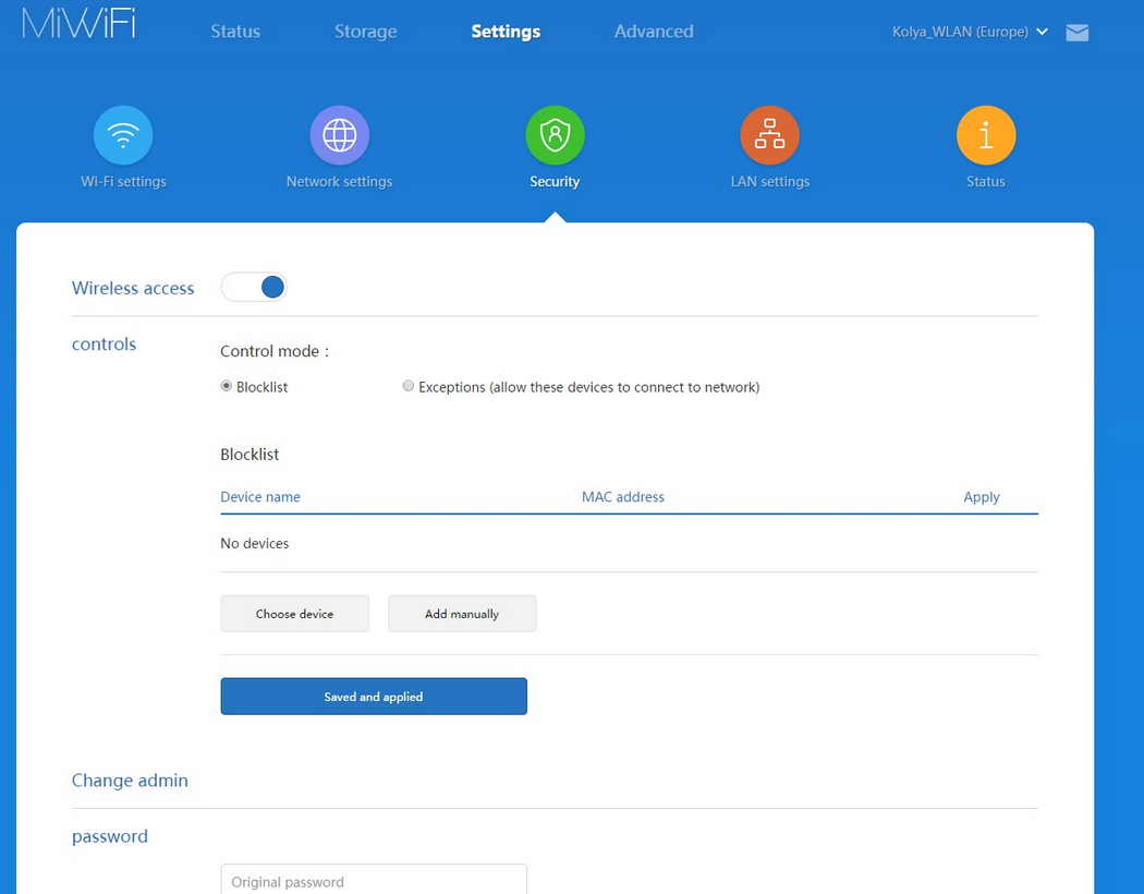 В разделе «» изменяется пароль для входа в веб-интерфейс, устанавливается запрет на подключение устройств к точке доступа по их -адресах и девайсов, имеющих доступ до веб-интерфейса настроек.