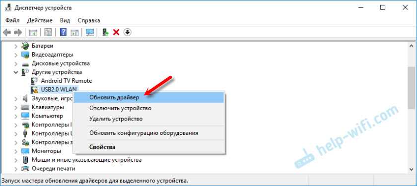 Если же нет (как у меня на скриншоте выше, только файлы), то в диспетчере устройств снова нажимаем правой кнопкой мыши на «Сетевой контроллер» или «USB2.0 WLAN» и выбираем пункт меню «Обновить драйвер».