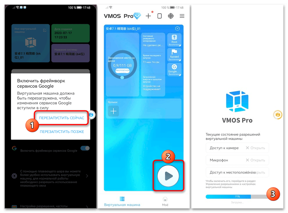 Тапните «ПЕРЕЗАПУСТИТЬ СЕЙЧАС» в окне-запросе «Включить фреймворк сервисов Google». Далее нажмите на кнопку запуска виртуальной машины в её блоке на главном экране VMOS.