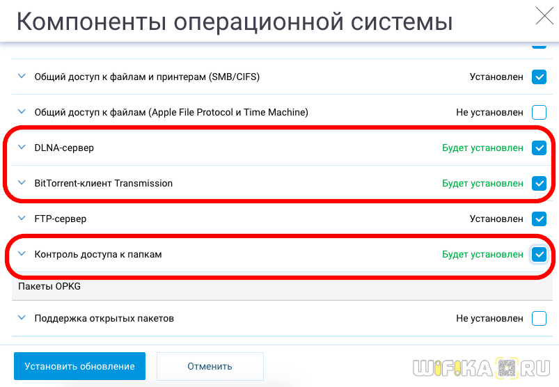 Точно таким же образом и устанавливаем новые компоненты Zyxel Keenetic. Ставим флажок напротив нужного модуля — появится текст «Будет установлен» зеленого цвета.